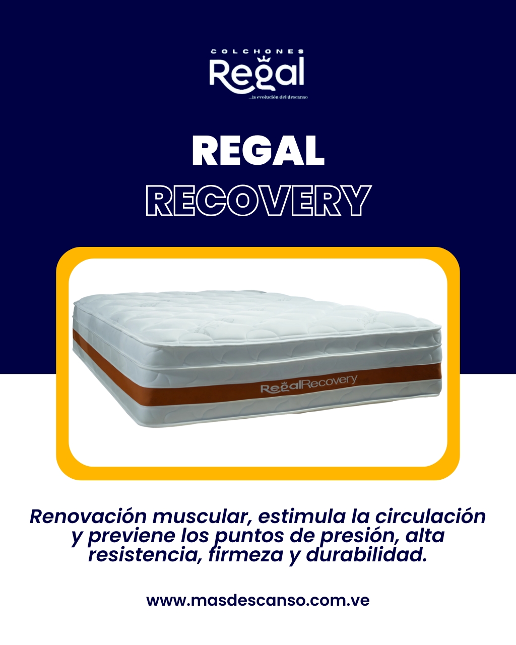 Disponible en tamaños individual (100×190 cm), matrimonial (140×190 cm), queen (160×190 cm) y king (200×200 cm). ¡Elige el colchón Regal Recovery y despierta renovado cada mañana!